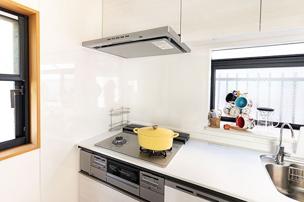 また、お掃除の負担を軽減できるように、当社担当よりフラットで拭きやすいガラストップのガスコンロや凹凸が少なく汚れが付きにくいレンジフードをご案内しました。「キッチン本体はシンプルな仕様ですが、使い勝手も掃除のしやすさも十分快適です」とお話しくださいました。