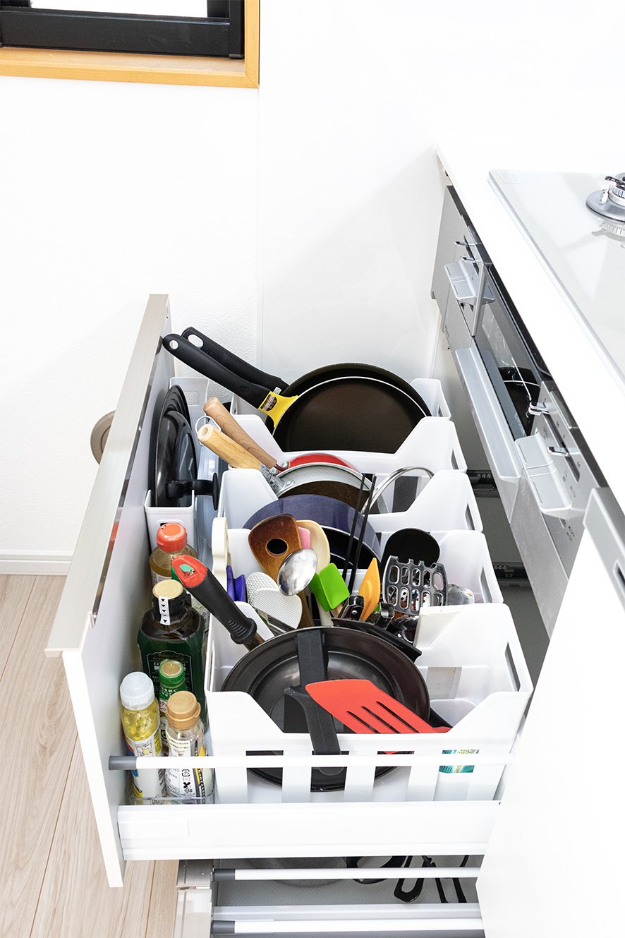 シンク下の引き出しは2段にし、下段は細かく仕切って缶詰や調味料、レトルト食品など保存の利くものを収納。コンロ下の引き出しには整理用のボックスを入れて、鍋やフライパンを縦に収納されています。高い収納力に奥様の見事な整頓術を合わせることで、さらに快適なキッチンになりました。