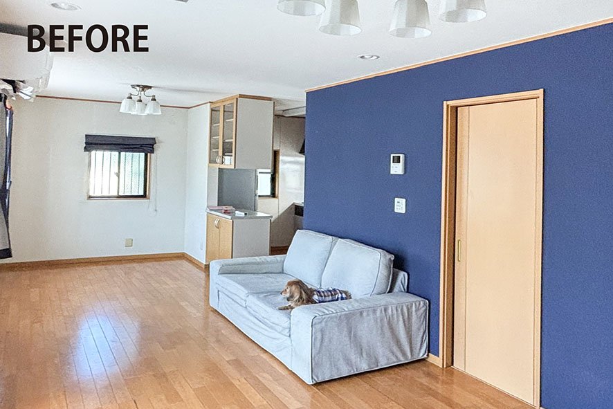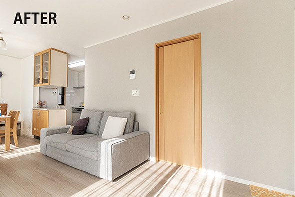 奥様は紺色がお好きで、施工前は紺のアクセントクロスを貼られていました。今回は「気分を一新したい」との思いからライトグレーを選択。それに合わせて、キッチンの面材とフローリングには明るめの木目柄を組み合わせています。