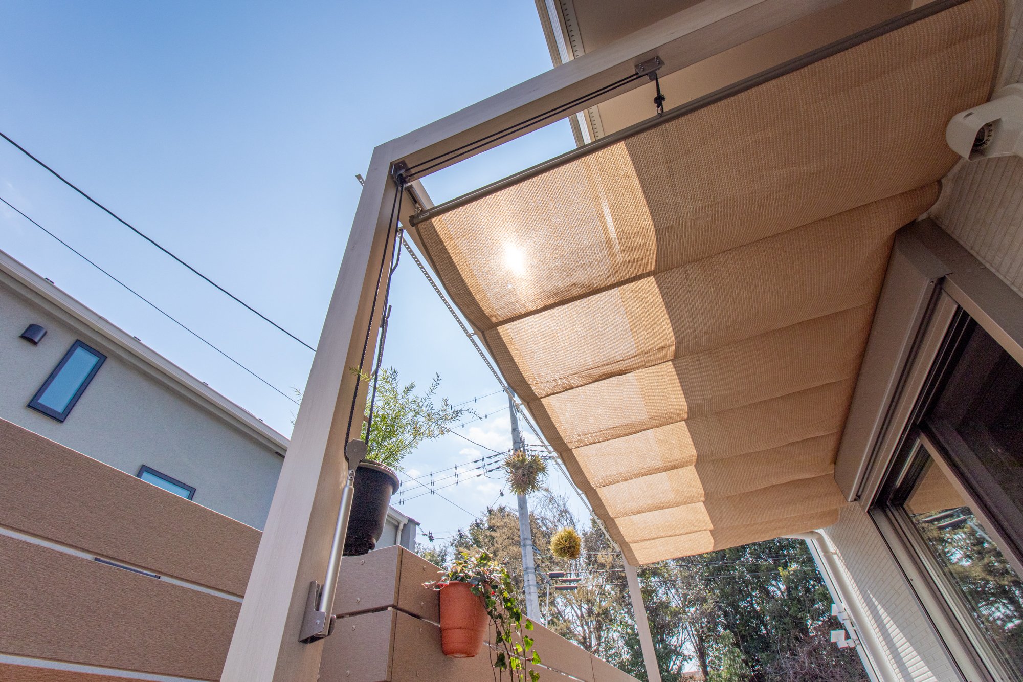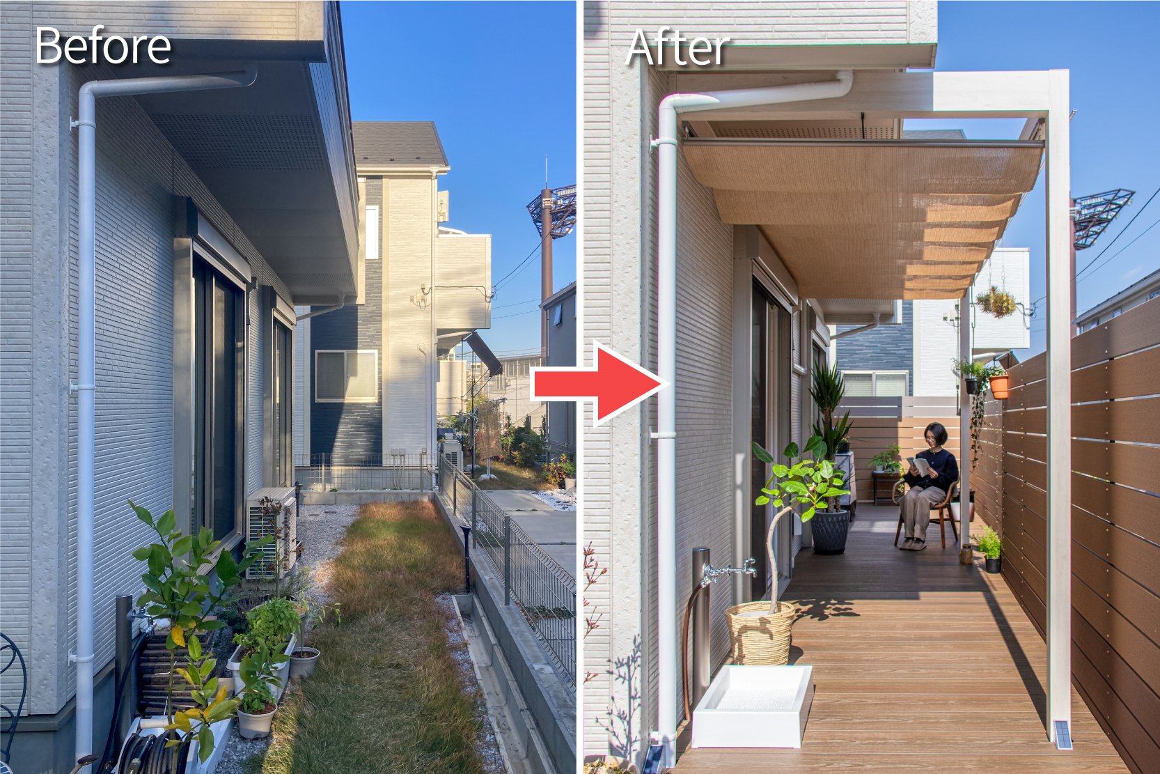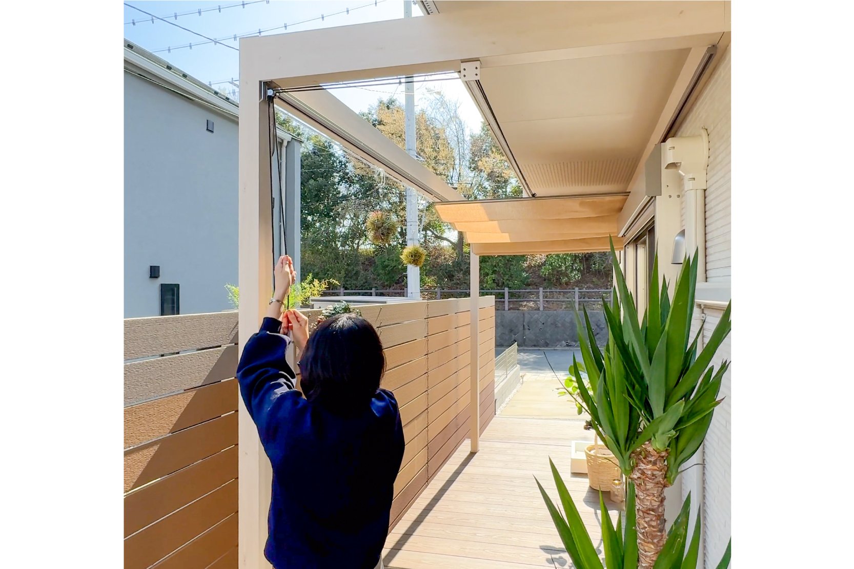 さらに、直射日光に弱い観葉植物を守るため、パーゴラ(日よけ)を設置されました。建物の外壁やウッドデッキと調和する色を選び、非日常を感じさせる、洗練された雰囲気に。日差しを程よく和らげてくれるため、植物を保護するだけでなく、お庭で過ごす時間をより快適にしてくれます。