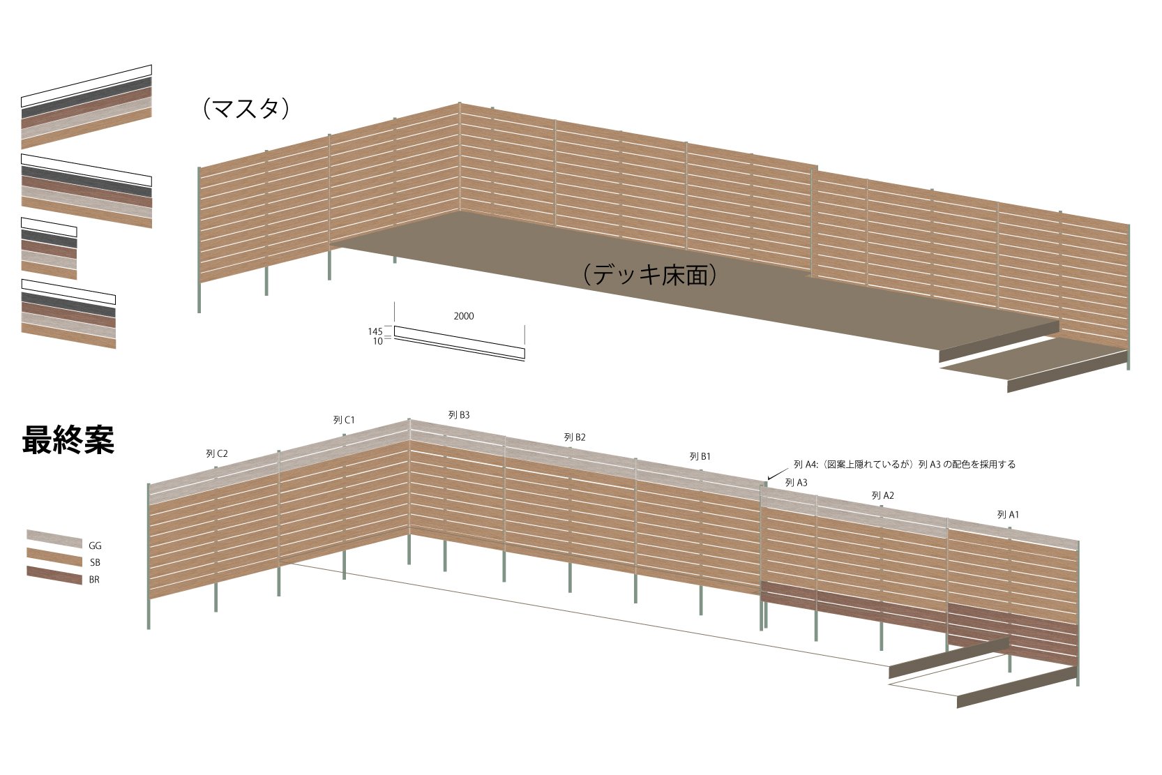 3色のグラデーションにより、奥行きを演出しました。上部の板材を明るい色にすることで、高さのあるフェンスでも圧迫感を感じにくい仕上がりとなっています。