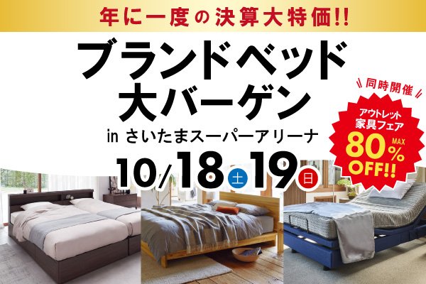 10月18日(土)・19日(日)の2日間、さいたまスーパーアリーナにて「ブランドベッド大バーゲン」を開催いたします!ベッドの有名ブランドメーカーシモンズ社の商品を安心・納得の決算特価にてご提供いたします。どこよりもお買い得な家具を大ホールならではの圧倒的な展示数と品ぞろえでご用意しています。最低価格保証、最大36回分割金利手数料無料等会場ならではのサービスも充実!