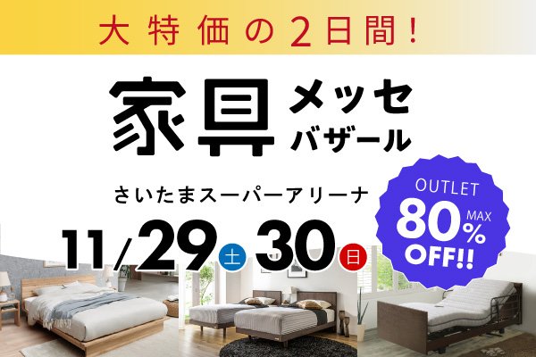 11月29日(土)・30日(日)の2日間、さいたまスーパーアリーナにて「家具メッセバザール」を開催いたします!さいたまでの超お買い得家具催事!安心・納得の会場特別割引、メーカー希望小売価格より最大最大80%OFFのアウトレットコーナーなど、どこよりもお買い得な家具を、圧倒的な展示数と品揃えでご用意。インテリアコーディネーター無料相談や、最大36回金利手数料無料など、会場ならではのサービスも充実!