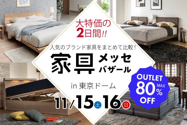 12月20日(土)・21日(日)の2日間、東京ドームにて「家具メッセバザール」を開催いたします。安心・納得の会場特別割引、メーカー希望小売価格より最大最大80%OFFのアウトレットコーナーなど、どこよりもお買い得な家具を、圧倒的な展示数と品揃えでご用意。インテリアコーディネーター無料相談や、最大36回金利手数料無料など、会場ならではのサービスも充実!