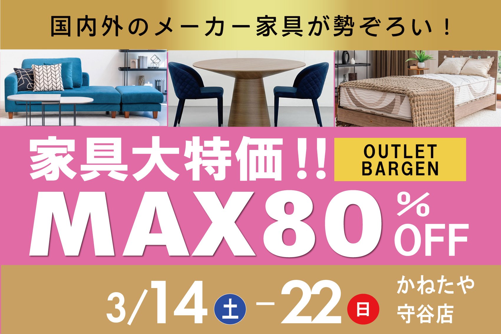 3月14日(土)から22日(日)まで、かねたや守谷店にて「アウトレットバーゲン」を開催いたします。アウトレット商品の大幅割引、新品お取り寄せ品も割引価格でのご提供いたします。最大36回分割金利手数料無料、不要家具のお引取りも格安にてお承りいたします!会期中限定のサービスも充実!この機会に是非ご来店くださいませ。