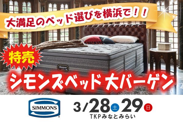 3月28日(土)・29日(日)の2日間、TKPみなとみらいにて「ブランドベッド大バーゲン」を開催いたします!ベッドの有名ブランドメーカーシモンズ社の商品を安心・納得の決算特価にてご提供いたします。どこよりもお買い得な家具を大ホールならではの圧倒的な展示数と品ぞろえでご用意しています。メーカーコラボのオリジナルお買い得商材あり!最低価格保証、最大36回分割金利手数料無料等会場ならではのサービスも充実!